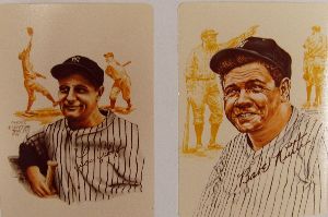 Postcards of Babe Ruth and Lou Gehrig from the 1979 Signature Miniatures Statues.